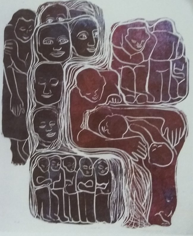 Compondo uma configuração com linhas brancas, a artista entrosa os seres humanos em agrupações: ora os rostos estão colocados em sequência na vertical, ora os seres estão lado a lado, sem contar a sintonia nas formas recortadas em que a figura acalento que acolhe os filhos em momentos preciosos de carinho e afeição.