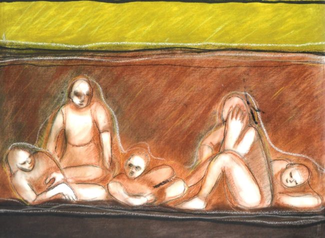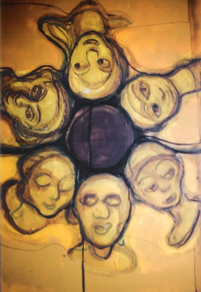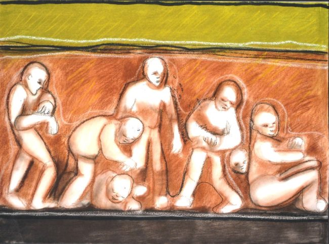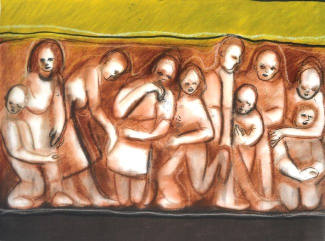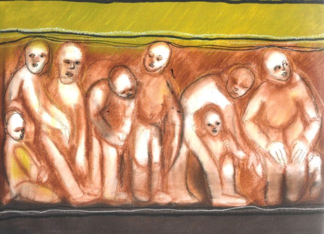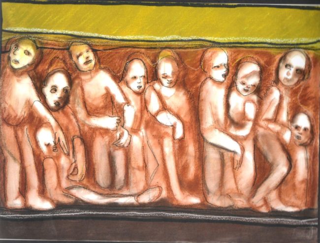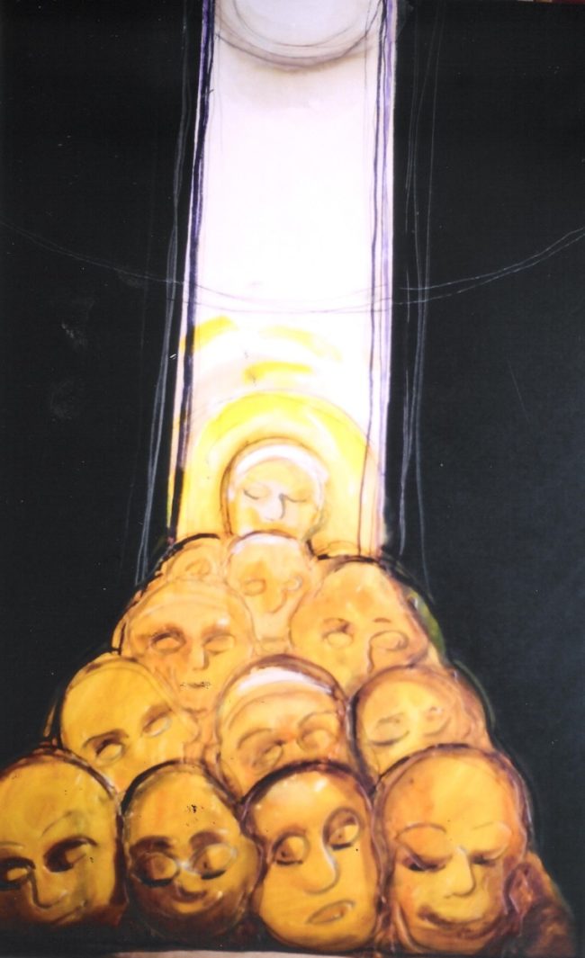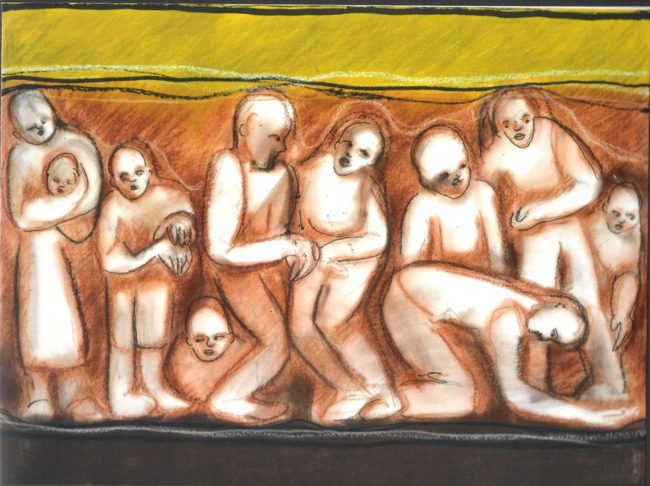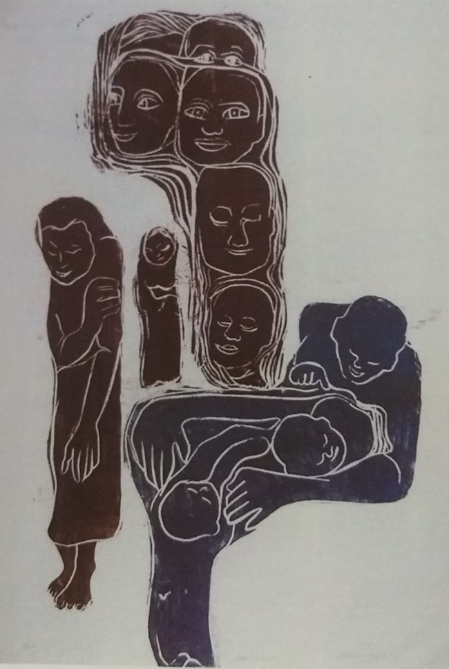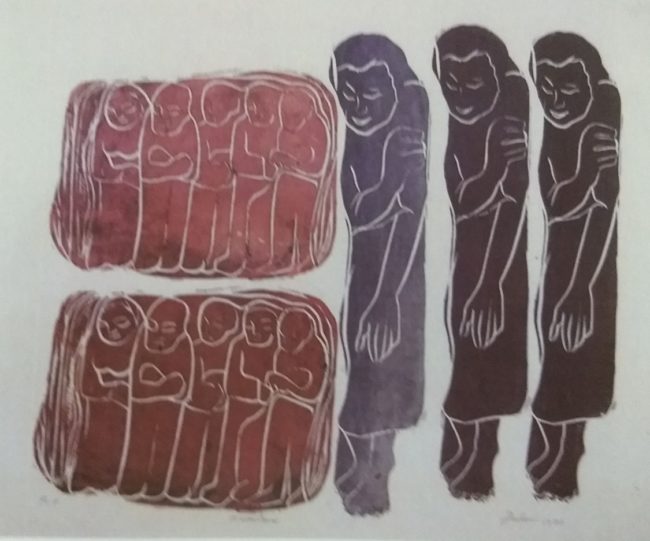 As articulações das peças são agrupadas, reorganizadas e impressas alterando as cores, assim formando novas situações de relações entre os seres criados. A comunidade representada está atenta num sincronismo de que aludem à tristeza. Há nessa conjunção de formas e transmissão de uma espécie de cerimônia, algo que relaciona o “mito”, a “vida” e o sentimento de bondade e compreensão.