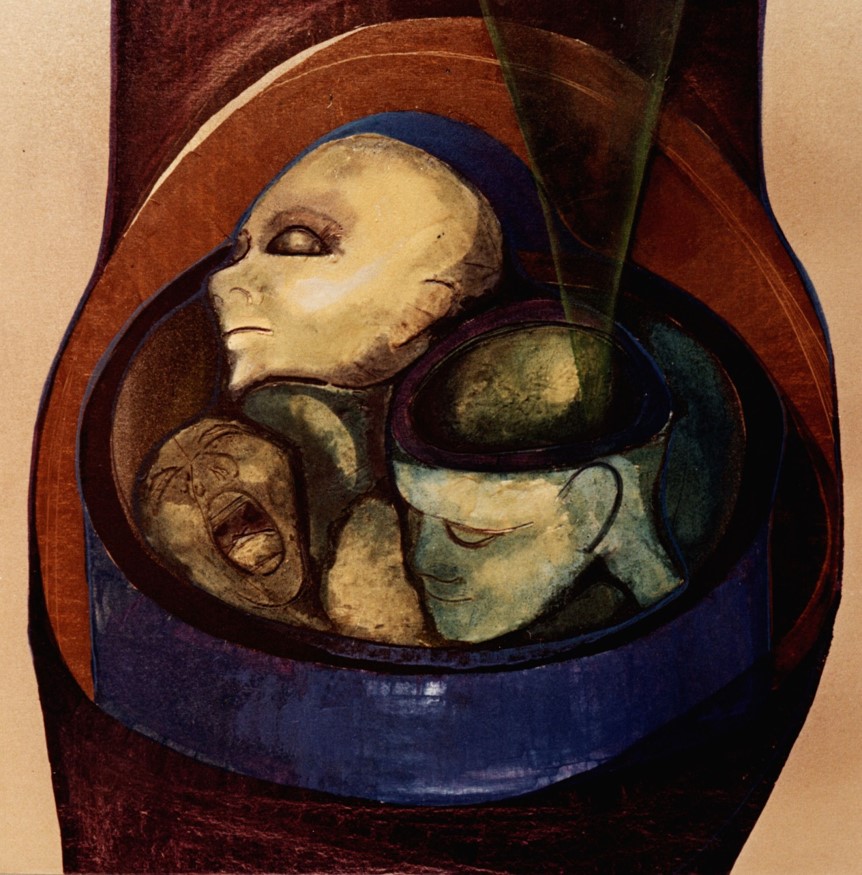 A sala de anatomia ora nos mostra um olho enorme como um globo, ora uma barriga que envolve seu dono, mais adiante de um crânio cortado saem outros crânios e das seções praticadas nos seres em lugar de sangue, aparece um jogo de bonecas russas, brinquedo inesperado, salvando à beira do colapso. A repetição parece a coexistência geradora de repulsos e atração que marca e desgasta mas, nos mantém vivos.